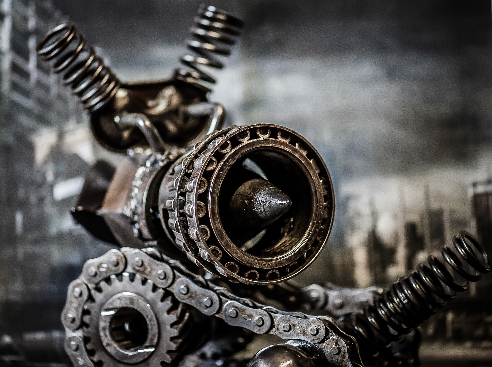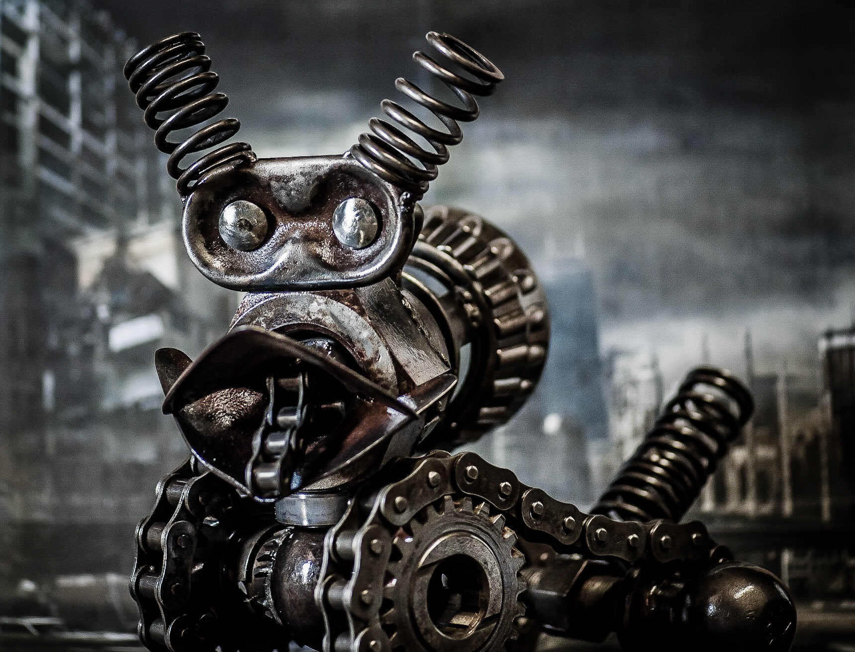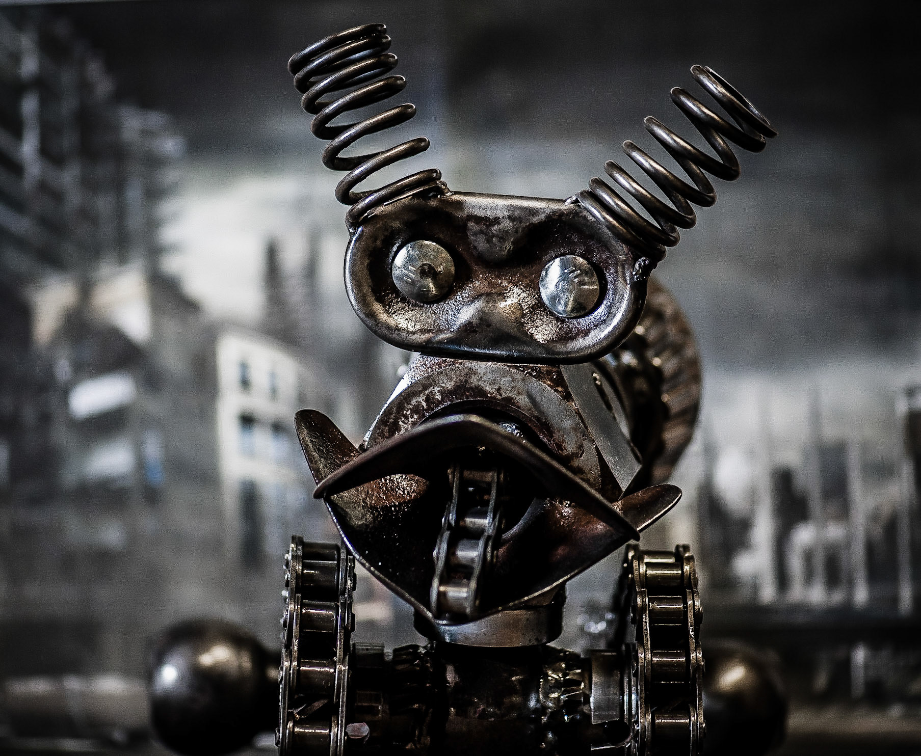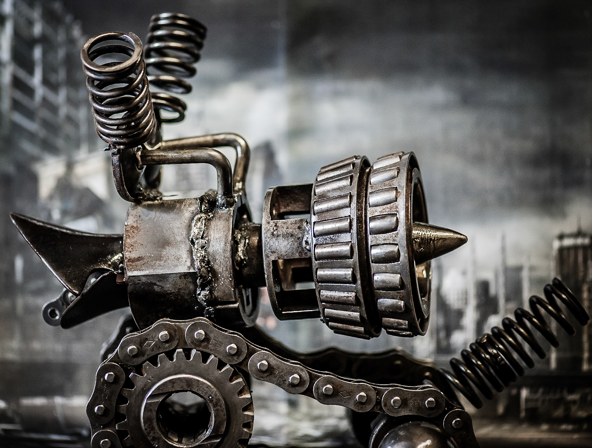 Measuring 35cm long and 33cm tall, he's one heavy duty canine. Made from a combination of vintage farm machinery, truck bearings, motorcycle chains, gearbox components and valve springs he's going to keep watch over your possessions! AUD$495