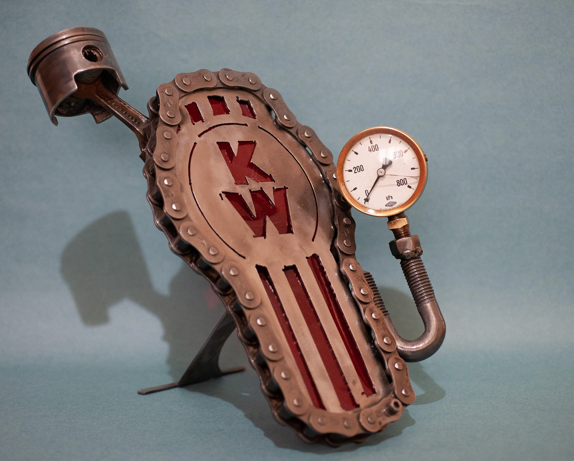 Measuring 35cm tall, this piece has been manufactured from reclaimed engine components, chains and a classic brass escutcheon gauge. Would make a statement in any truckers den! AUD$195.00.